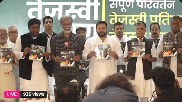 बिहार विधानसभा चुनाव के लिए आज पटना में महागठबंधन ने तेजस्वी प्रण नाम से अपना साझा घोषणापत्र जारी किया। घोषणापत्र में सरकार बनने पर 20 महीने में राज्य में विकास की नई धारा बहाकर बदलाव लाने का वादा किया गया है। महागठबंधन ने कहा कि बिहार को बीजेपी-जेडीयू के कुशासनराज से निकालकर, हर बिहारवासी को सम्मान, सुरक्षा, सुविधा और उचित अवसर देना हमारा लक्ष्य है।