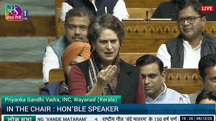 لوک سبھا میں آج ’وندے ماترم‘ پر بحث کے دوران کانگریس رکن پارلیمنٹ پرینکا گاندھی نے برسراقتدار طبقہ کو زبردست انداز میں نشانے پر لیا۔ انھوں نے وزیر اعظم نریندر مودی کا نام تو نہیں لیا، لیکن کئی مواقع پر آج ایوان میں وزیر اعظم کے ذریعہ دیے گئے بیان کی طرف اشارہ کر جوابی حملہ کیا۔ خاص طور سے ’وندے ماترم‘ کے حذف کردہ الفاظ سے متعلق وزیر اعظم مودی نے جو بیان آج دیا، اس پر کانگریس رکن پارلیمنٹ نے کہا کہ ’’ہمارے قومی گیت اور قومی ترانہ دونوں کا انتخاب اور تقرری میں سب سے بڑا کردار گرو دیو رویندرناتھ ٹیگور کا تھا۔ اسے آئین ساز اسمبلی نے بھی منظوری دی۔ اس پر سوال اٹھانا نہ صرف ہماری تحریک آزادی کے پروانوں اور عظیم ہستیوں کی بے عزتی ہے، بلکہ پوری آئین ساز اسمبلی کی بھی بے عزتی ہے۔